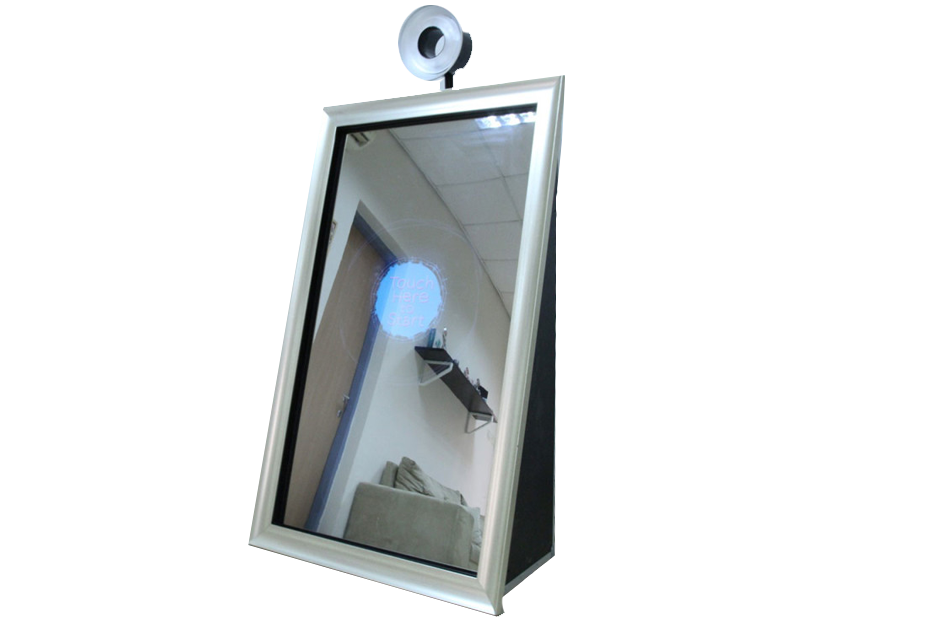 Touch screen mirror booth with a unique photo booth experience custom animations, sounds and effects.